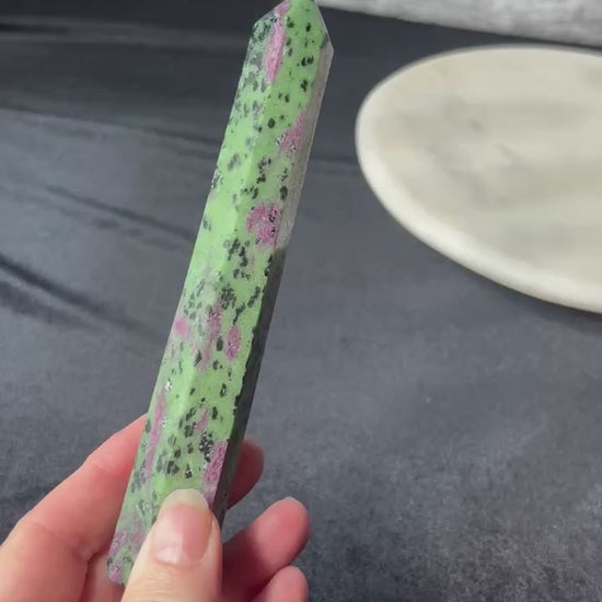Ruby Zoisite is beloved in metaphysical practices for balancing the heart and the mind, combining the fiery energy of Ruby with the calming, grounding nature of Zoisite.